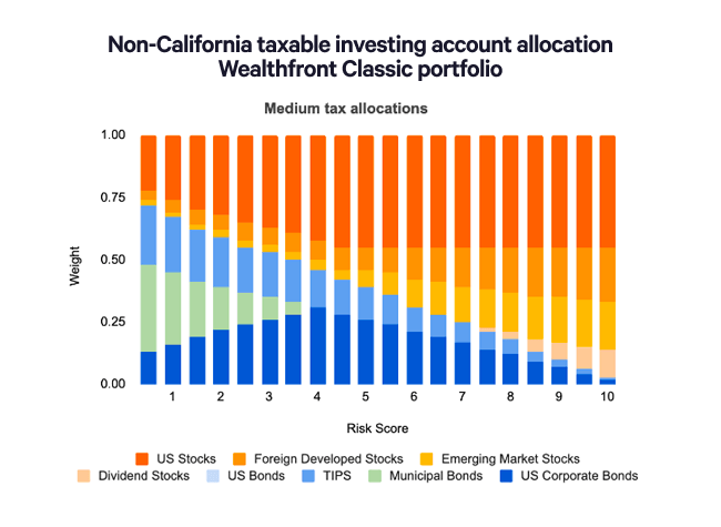 Let’s look at how these considerations play out in a medium tax level, non-California Classic portfolio. The chart below shows the asset allocation for each risk score.